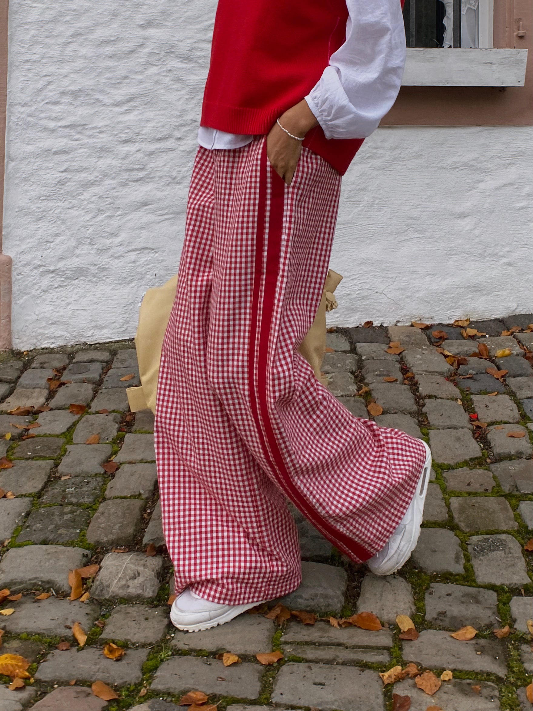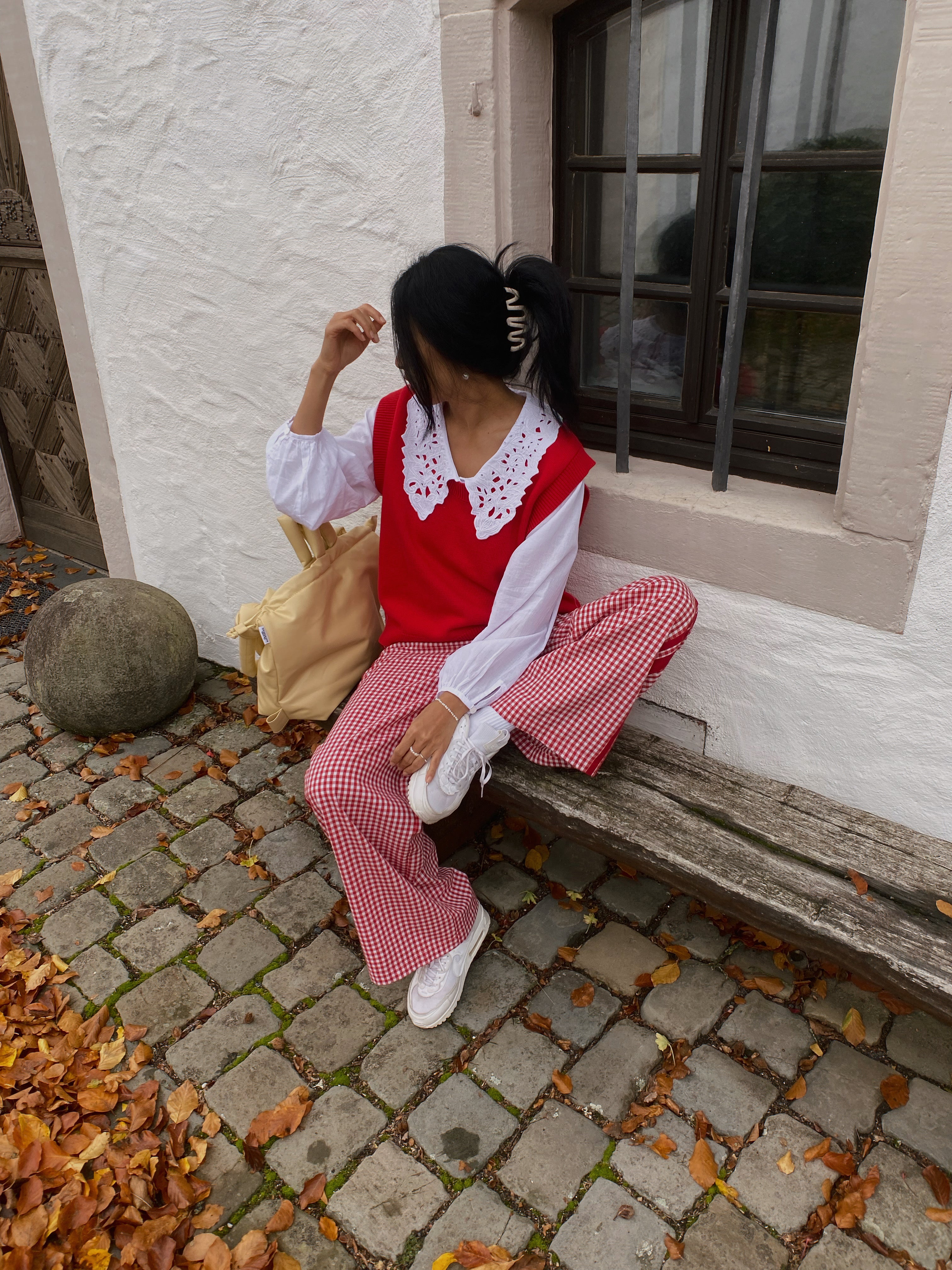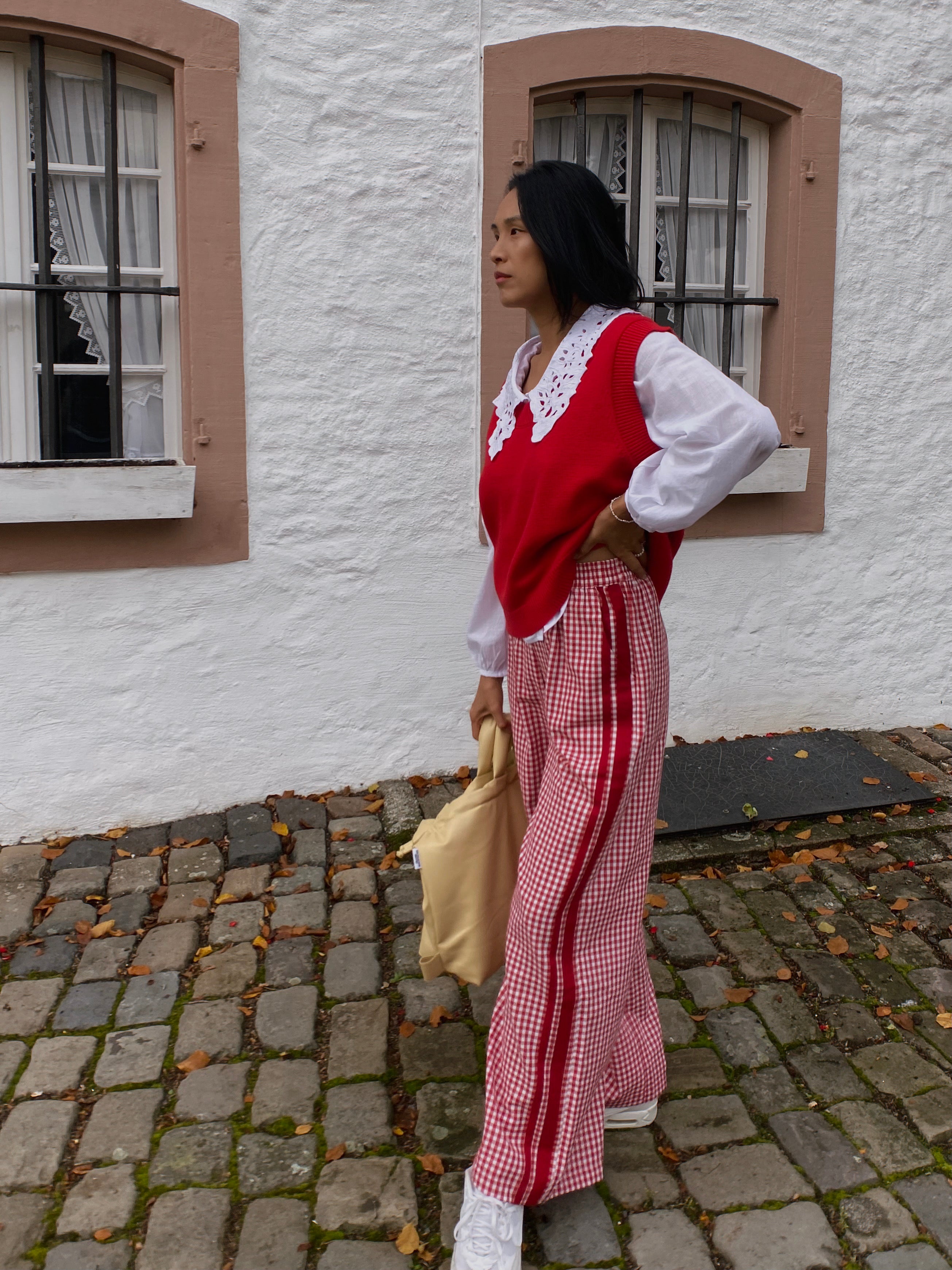 Person wearing a red sweater vest over a white shirt with a lace collar, red checkered pants, and carrying a beige bag.
