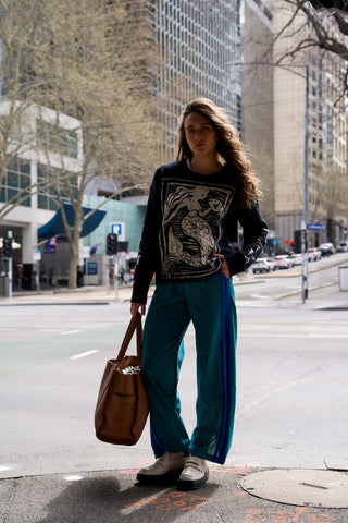 Jaya Linen Pant in Vogue animal print with 2 black side stripes by Zaziba Studio Australian fashion label